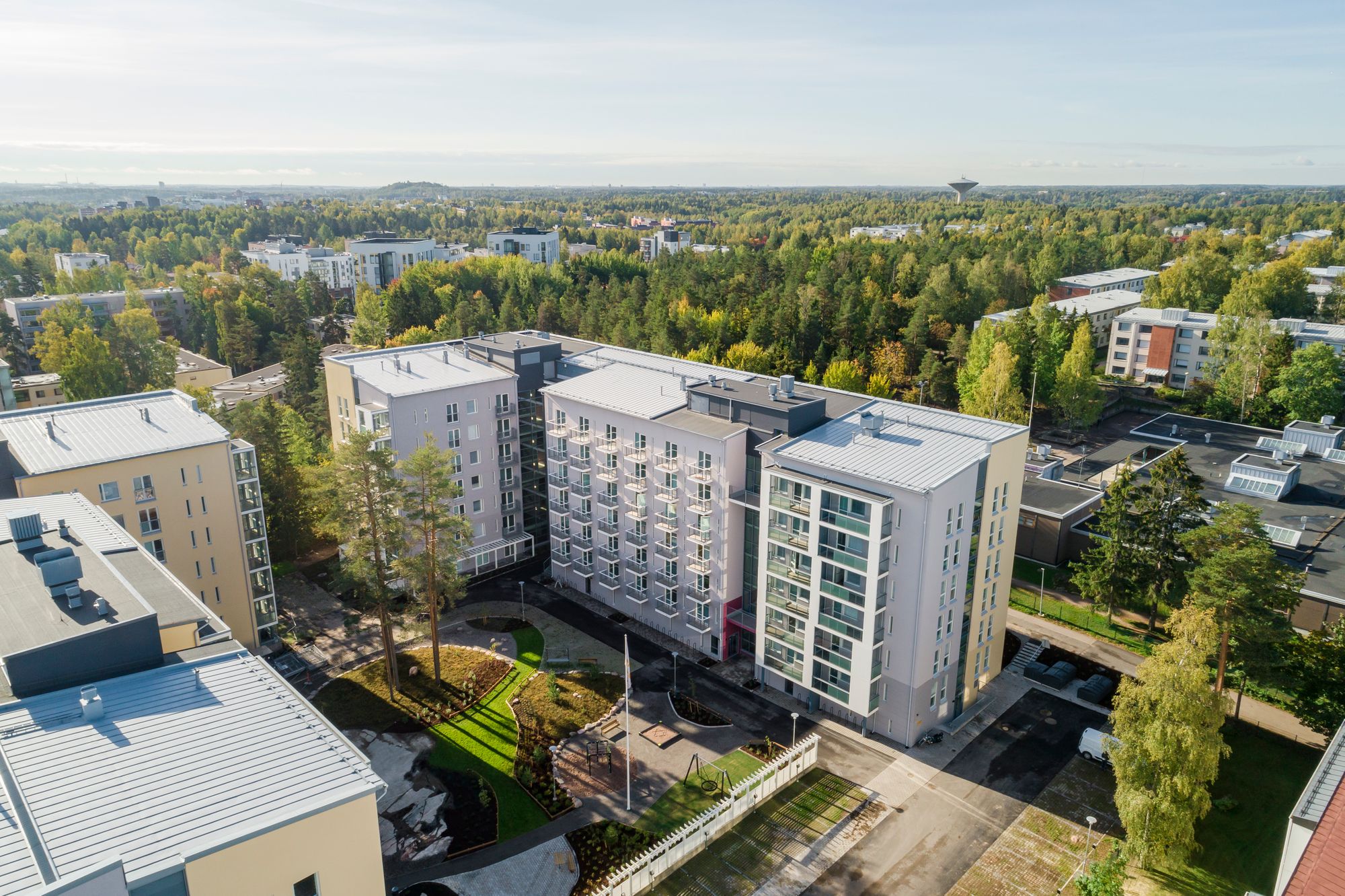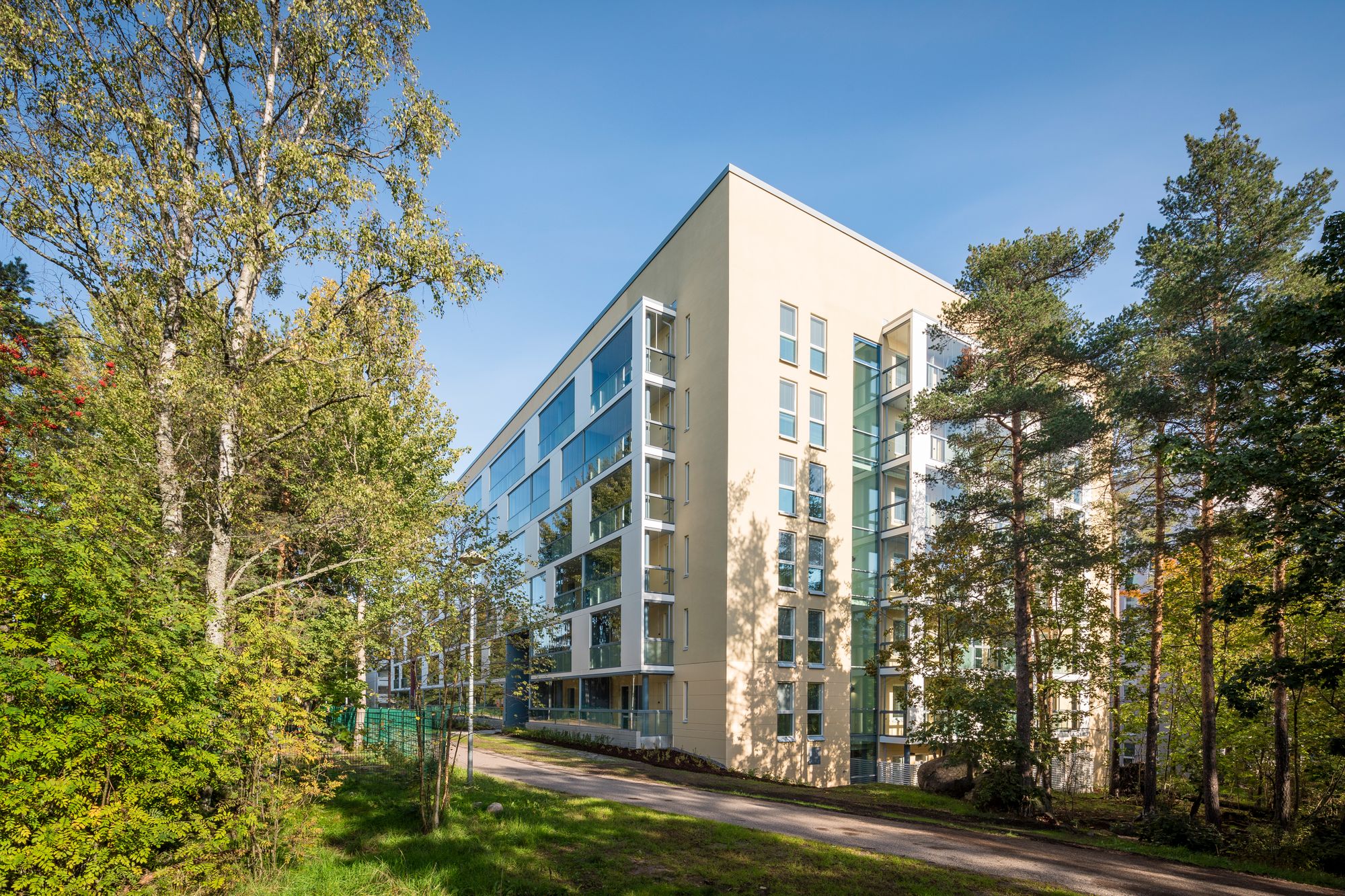 Asunnot ovat pinta-alaltaan suhteellisen pieniä, mutta ne on runkoratkaisujen ansiosta pystytty tekemään ilman hukkatiloja ja hyvin kalustettaviksi. Tiukasta mitoituksesta huolimatta asunnot ovat esteettömiä. Lasitetut parvekkeet ja ikkunoiden kautta avautuva kontakti metsämaiseen puistoon tuovat myös tilallista avaruutta asuntoihin.