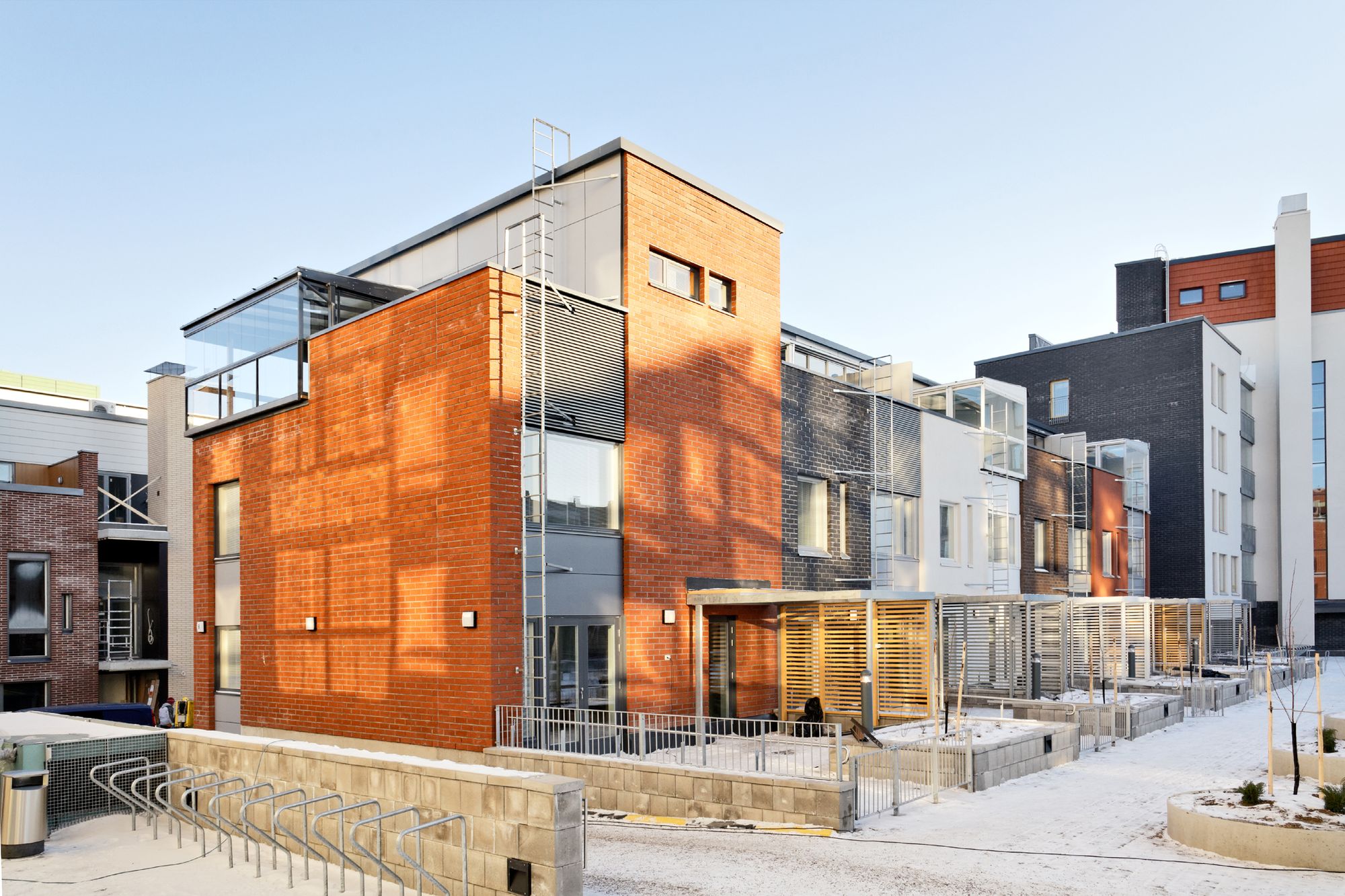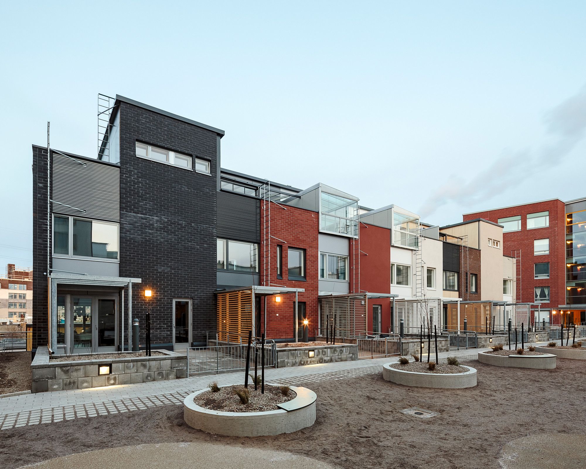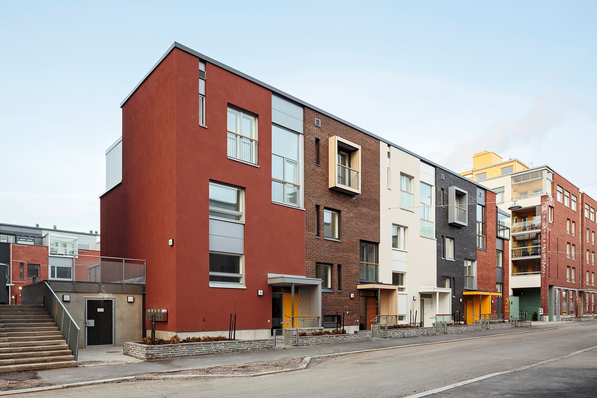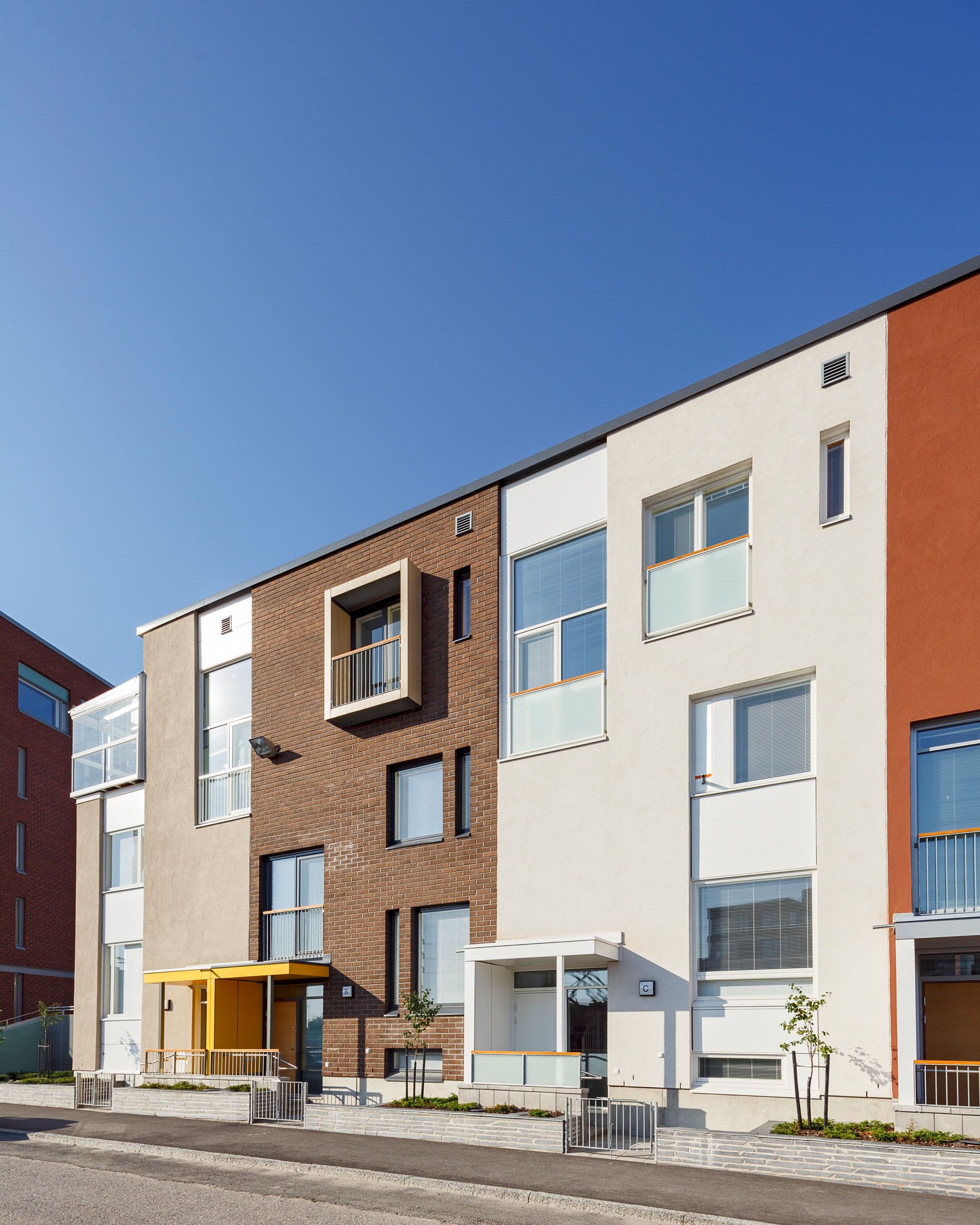 Kalasataman Huvilat offers individuality from facades to layout and fixtures. The townhouses are a small scale housing alternative with exclusive outdoor spaces in a dense urban district, located adjacent to the seafront and inner city of Helsinki.