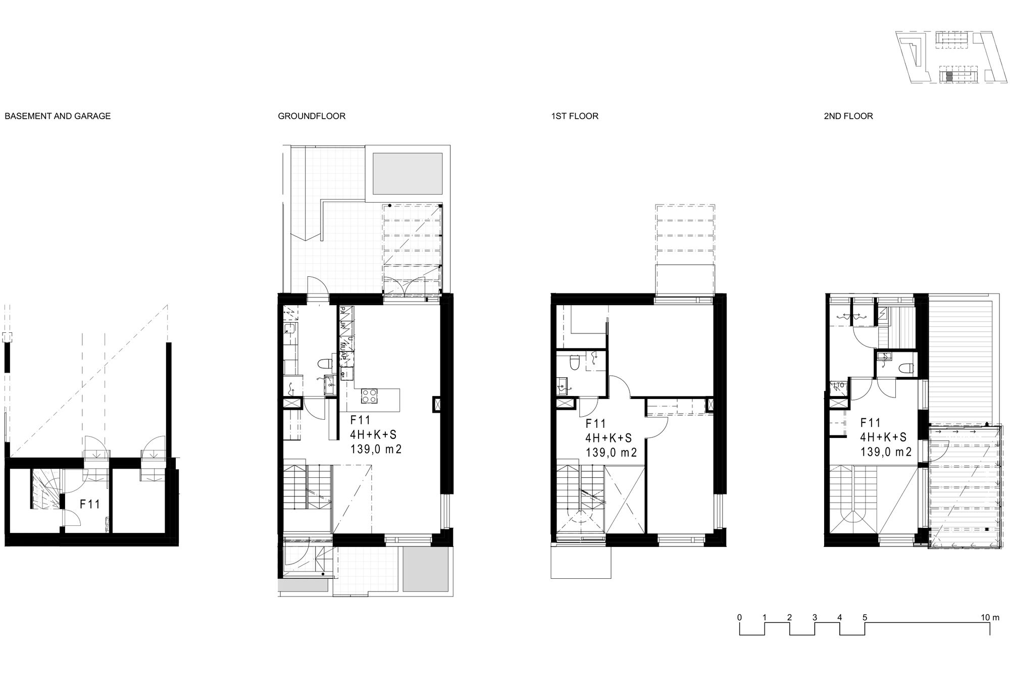 Each townhouse has parking located in the cellar; with living room, kitchen and utility room on the ground floor; bedrooms on the first floor and a roof terrace on the second floor.