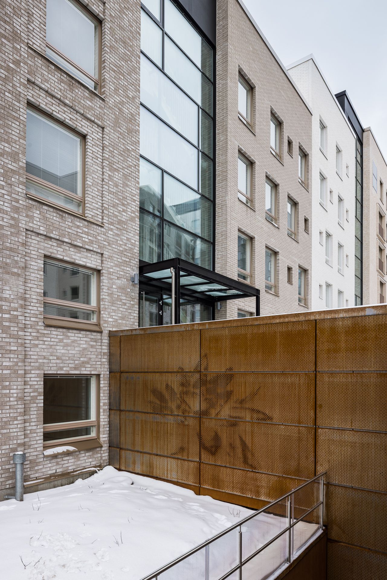 The facades are made of brick, cor-ten steel and umbra patinated concrete.