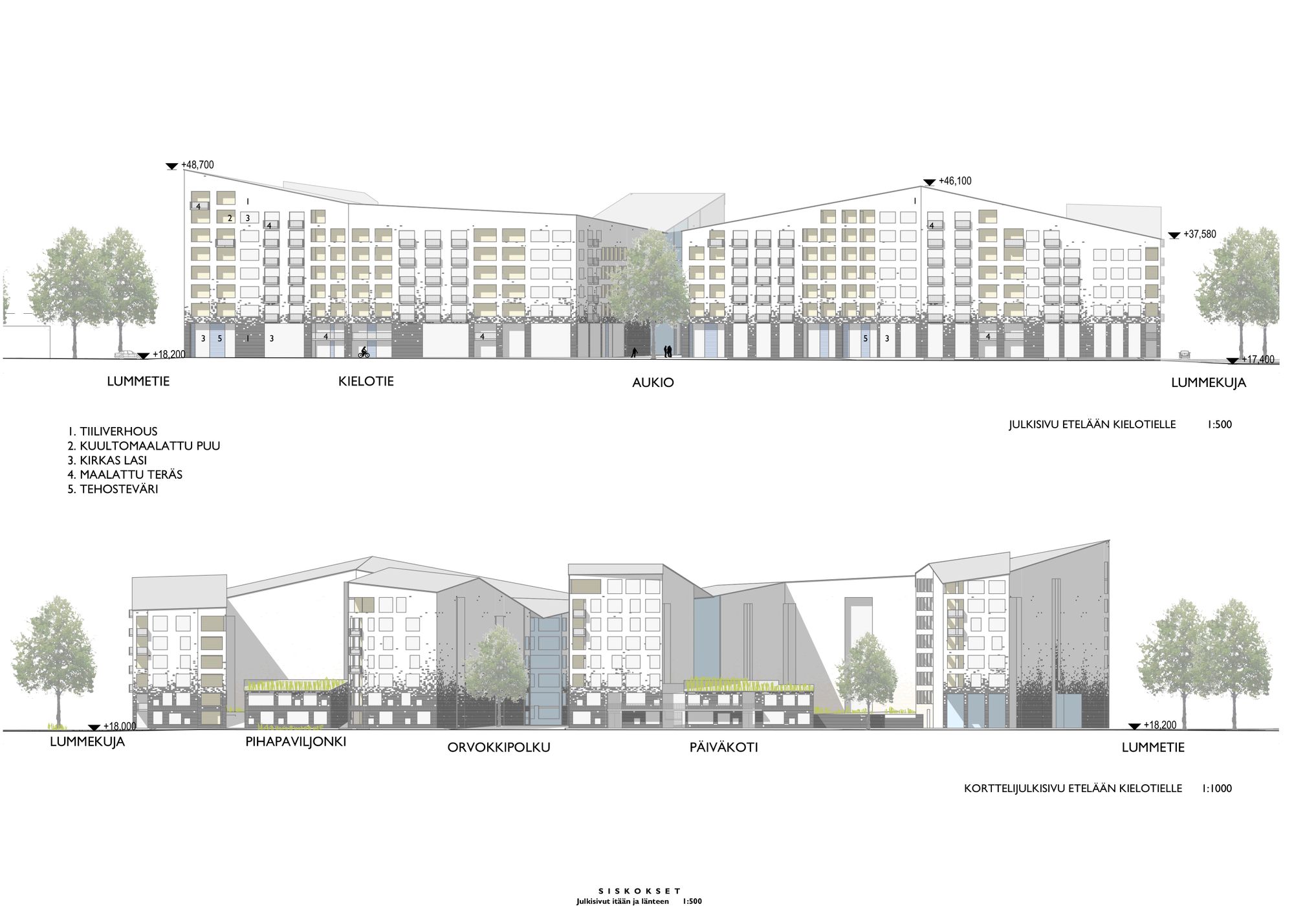 Orvokkikujan jatke jakaa suunnittelualueen kahteen kortteliin. Korttelin muodostavat Kielotien suuntaan vahvan kaupunkimaisen selkärangan, ja avautuvat uuden puiston suuntaan. Kortteleiden polveileva kattomaailma ja eloisa muuraus tekevät rakennuksista tunnistettavan ja mielenkiintoisen.
