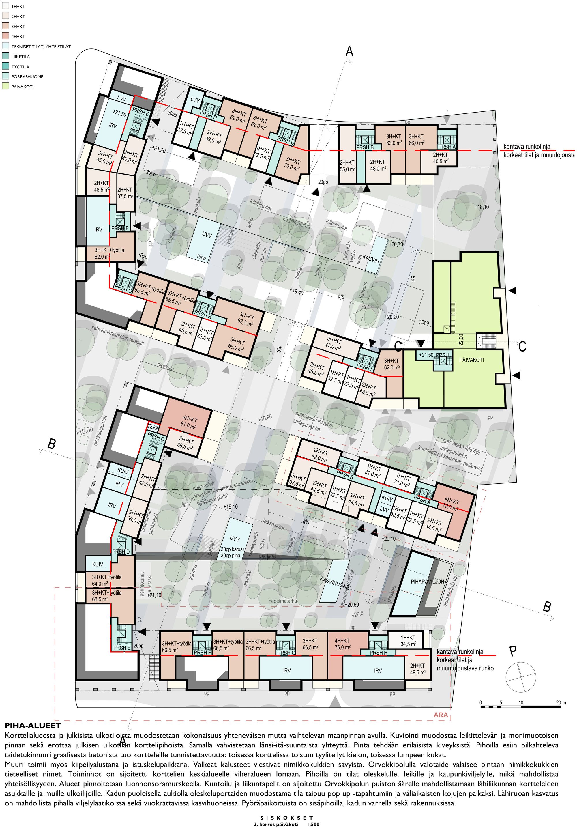 Rakennusten alimpaan kerrokseen Kielotien ja Lummekujan puoleisille sivuille on sijoitettu liike- sekä työtiloja. Korttelien sisäpihan puolelle ensimmäiseen ja toiseen kerrokseen on sijoitettu asuntoja sekä yhteistiloja.