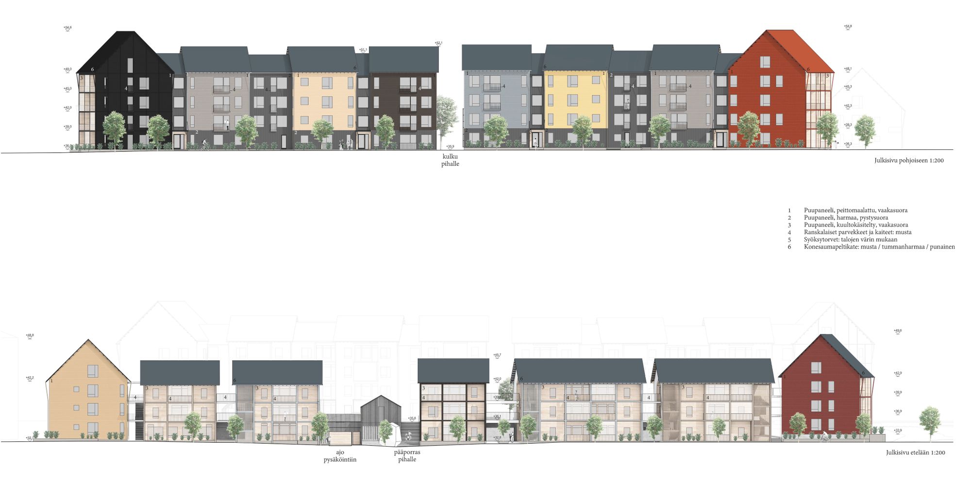Puuta käytetään rakennus- ja palomääräysten sallimissa puitteissa rakennuksen rungossa, julkisivuissa, täydentävissä rakennusosissa, sisätiloissa, piharakennuksissa ja -kalusteissa. Puuta käytetään myös julkisivujen täydentävissä osissa, sovituslistoissa ja yksityiskohdissa. Piharakennukset, kylmät portaat ja luhtikäytävät tehdään puurakenteisina.