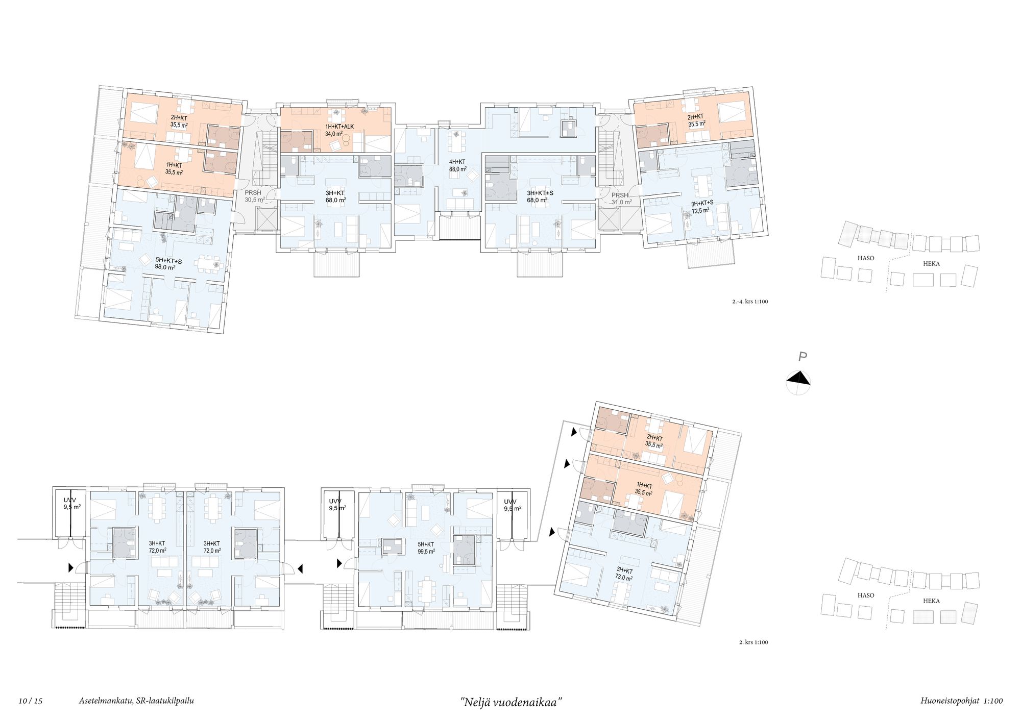 | Laajuus | HASO:48 asuntoa, 2892 h-m2, 4022 brm2, autohalli 767 brm2 HEKA: 54 asuntoa, 3000 h-m2, 4212 brm2, autohalli 718 brm2 |