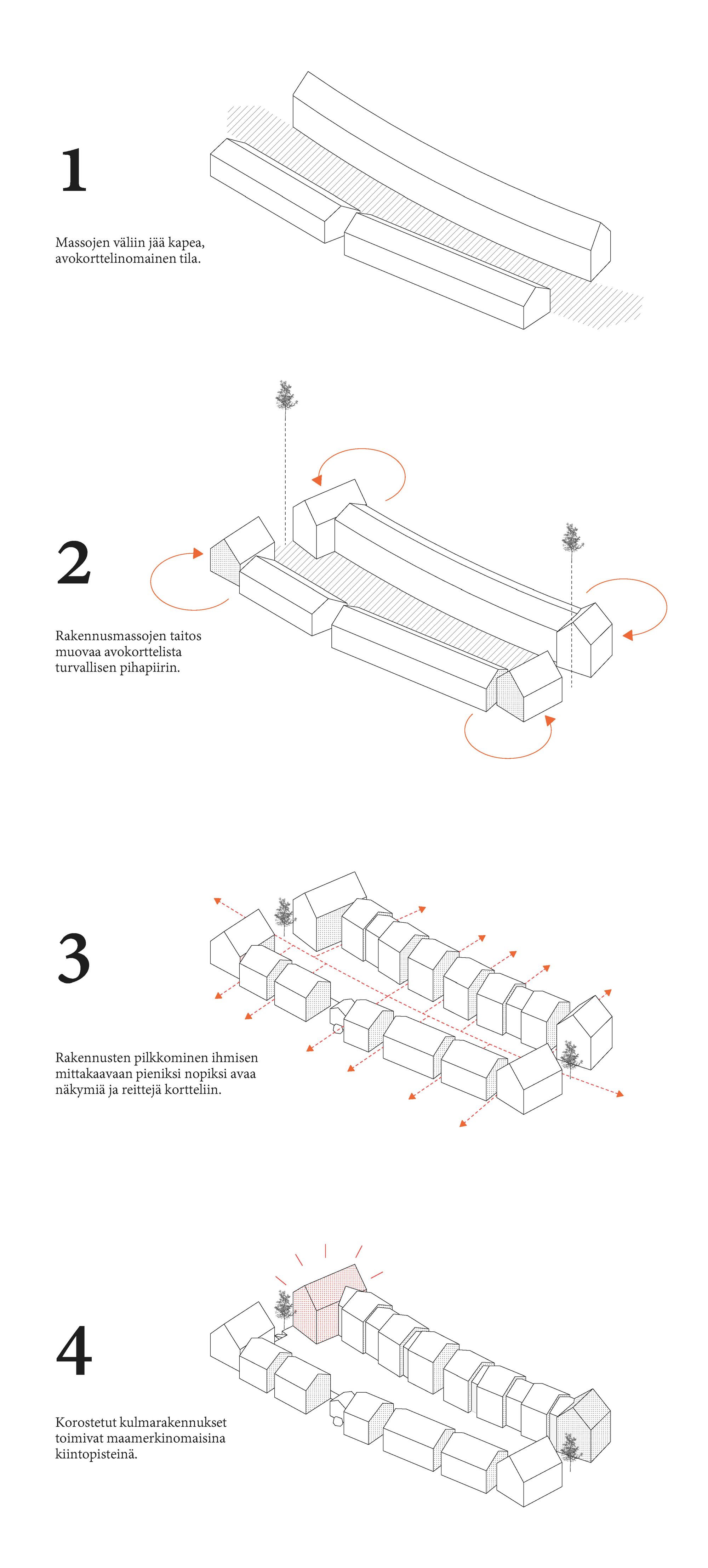 Kiilamaiset läpitalon porrashuoneet sovittavat rakennukset alueen kaarevaan katutilaan ja avaavat näkymiä läpi rakennuksen. Kolmikerroksiset rakennukset Asetelmankadunpuolella noudattavat samaa pienimittakaavaista jakoa. Portaat ja luhtikäytävät jakavat rakennukset pientalomaisiksi nopiksi ja avaavat korttelin läpi näkymiä. Asuntojen väliin jäävät intiimit sisäänkäyntipihat ja terassit sekä asuntojen omia varastotiloja.