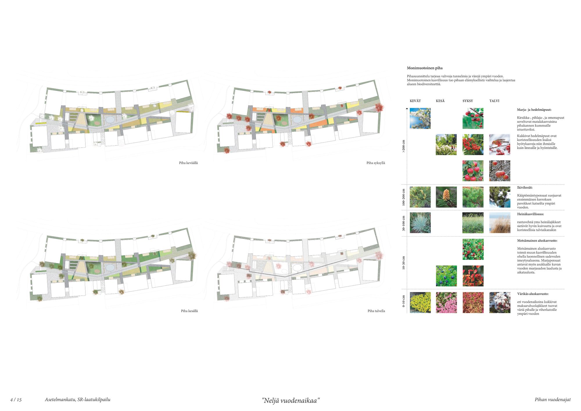 Pihasuunnitelman lähtökohtana tehdä pihasta houkutteleva kaikkina vuodenaikoina ja leikki- ja oleskelupaikkojen, sekä pelastusteiden ja tasoerojen ratkaiseminen luontevasti ja kauniisti.