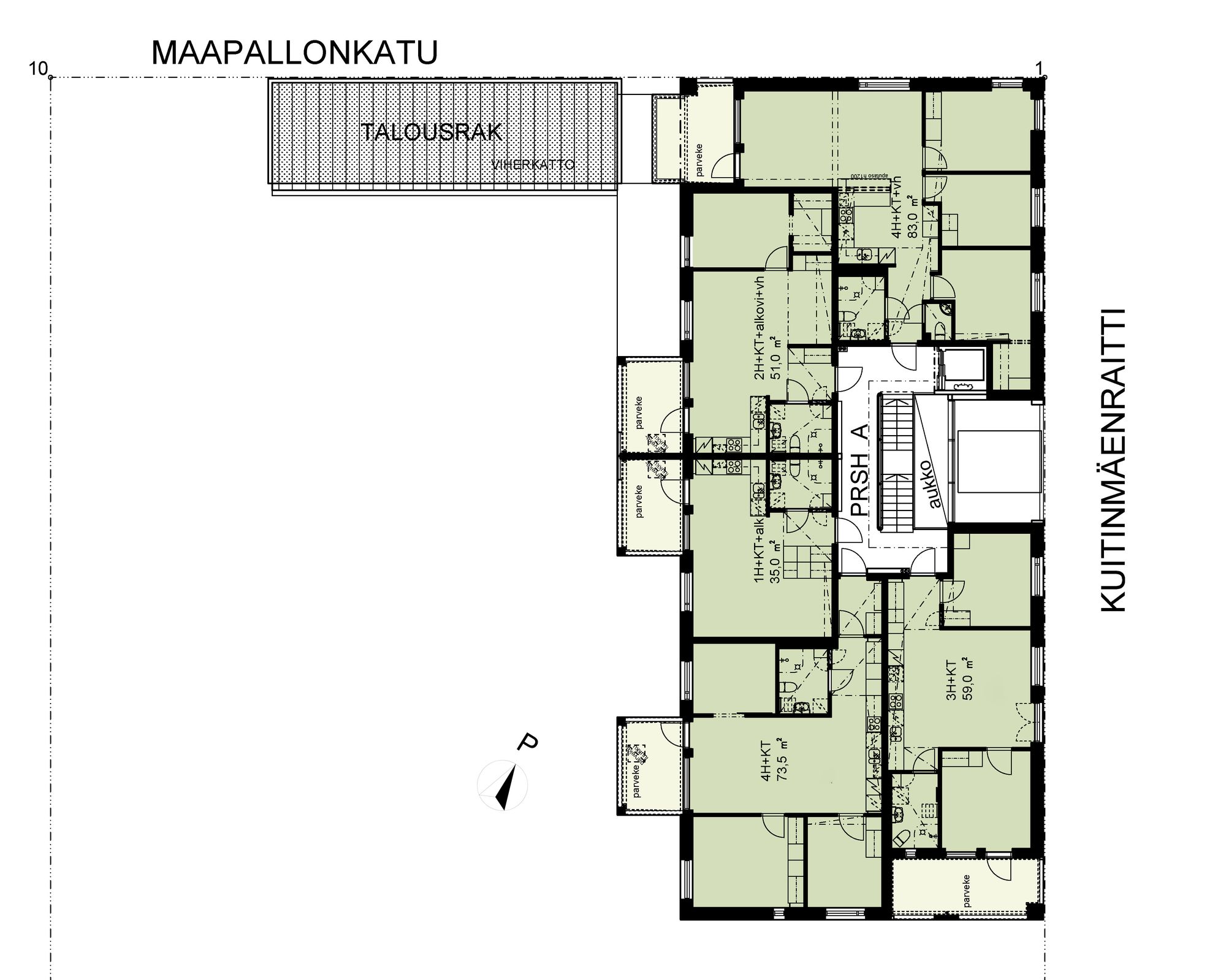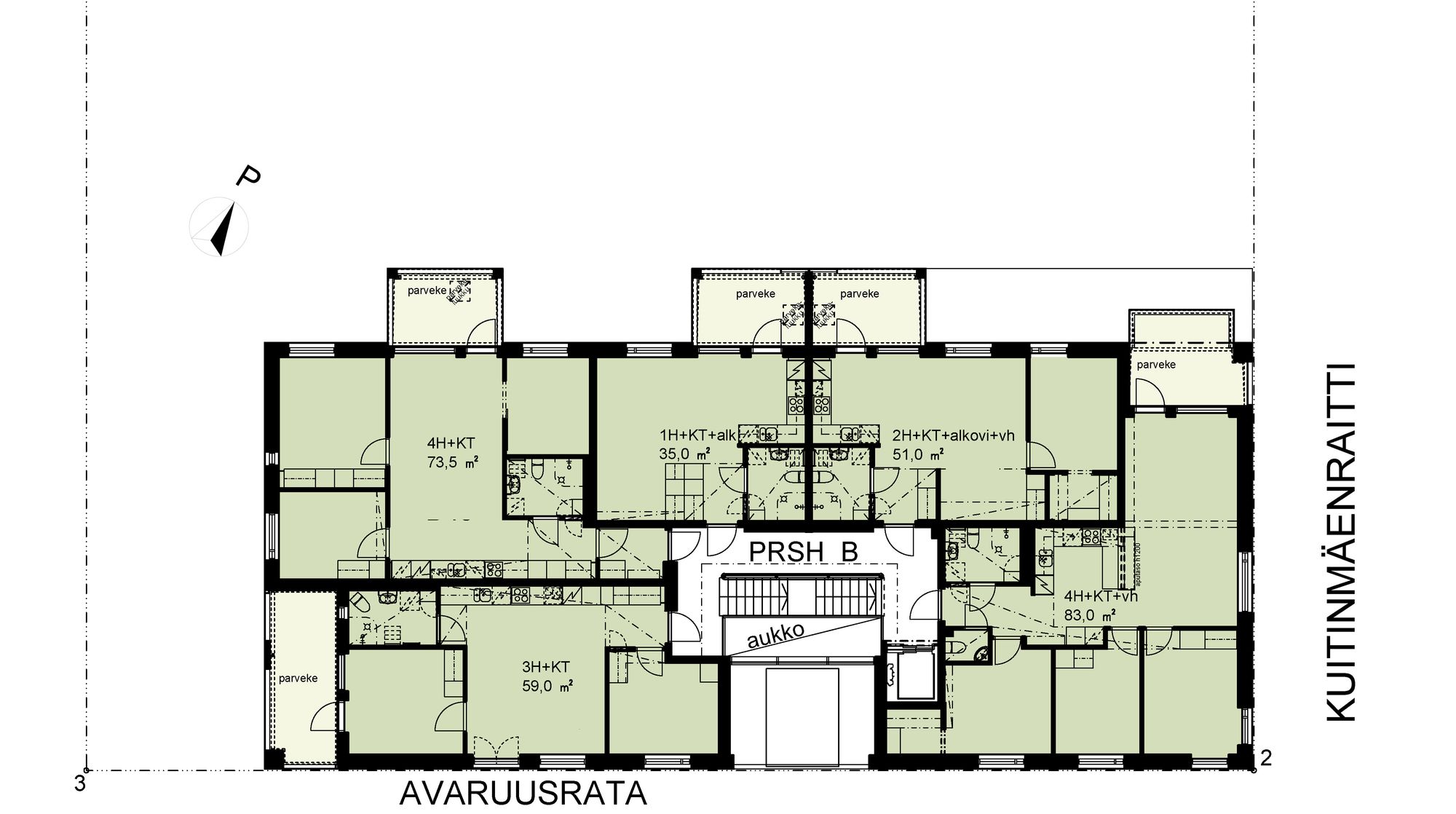 Huoneistojakauma on monipuolinen yksiöstä neliöön ja jokaisella asunnolla on parveke. Päätyasuntojen parvekkeet on sisäänvedettyinä integroitu osaksi talomassaa. Pihanpuolen parvekkeet ulottuvat kaavan sallimalla tavalla rakennusalueen ulkopuolelle.