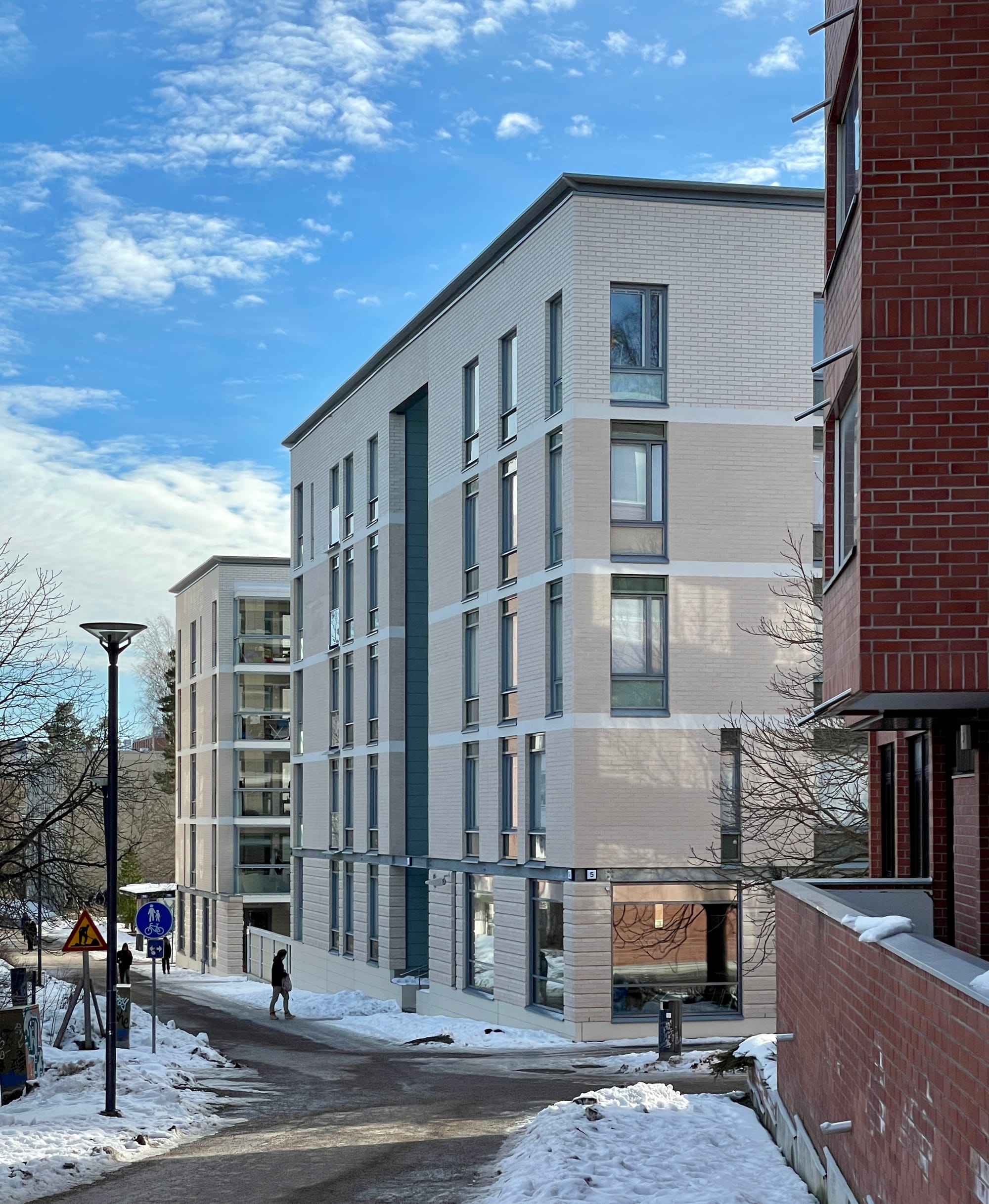 Pääasiallinen julkisivumateriaali on puhtaaksimuurattu vaalea tiili kaavan mukaisesti. Perustiili on vaaleankeltainen vaaleilla saumoilla. Ylin, 5. kerros, on erotettu valkoisella tiilellä, jotta talot liittyisivät paremmin korttelin kolmikerroksisiin taloihin.