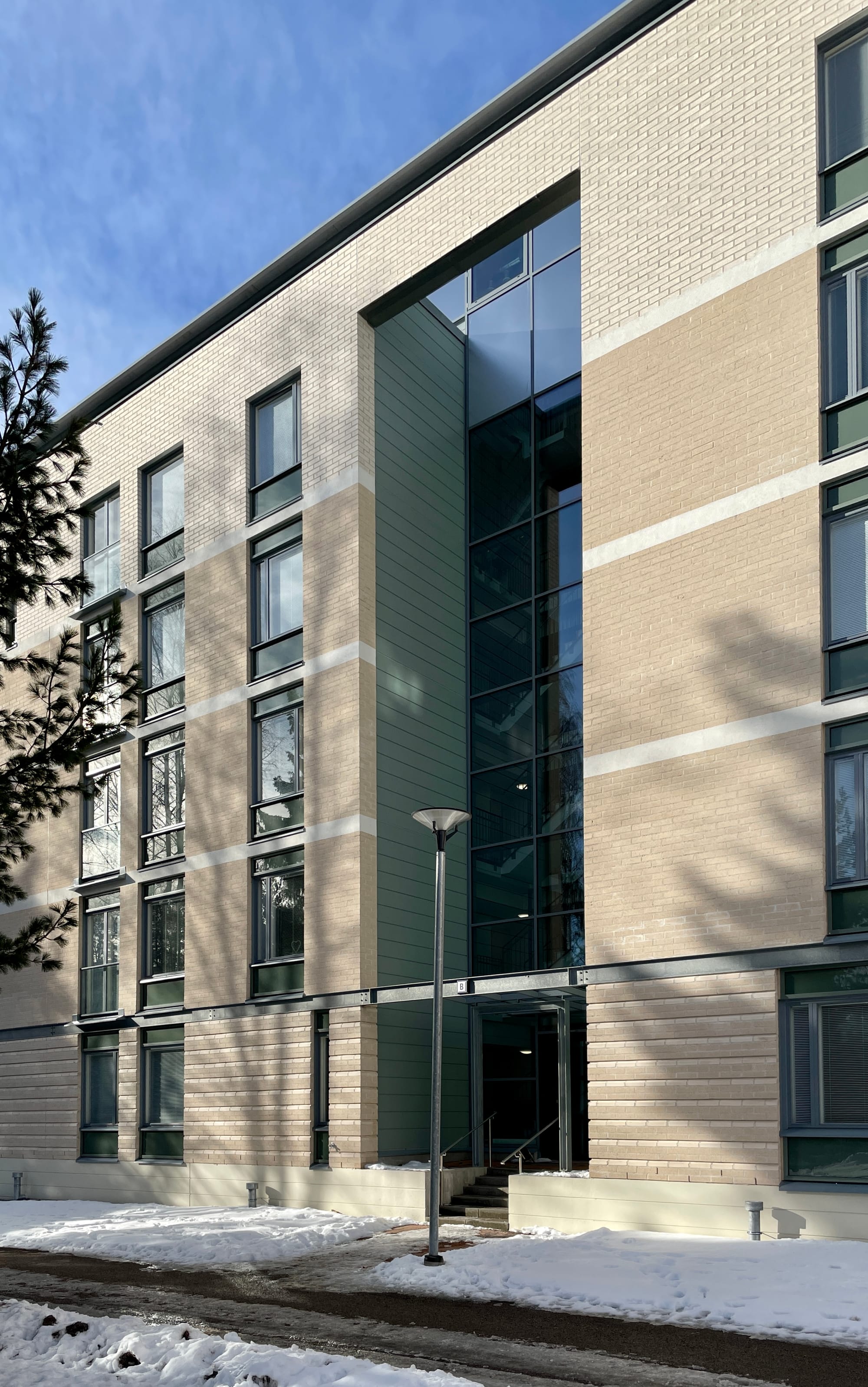 Rakennusten massoittelu on yksinkertaista, ja pyrkii sovittautumaan ympäröiviin vanhoihin 1970-luvun rakennuksiin. Julkisivumateriaalit ja -jäsentely liittyvät Olarin perinteiseen rakennustapaan: välipohjia korostetaan rakenteellisesti, ikkunat ovat kerroksen korkuisia julkisivulasien avulla, kuitenkin hienovarai-semmalla tavalla kuin 1960- ja 1970-lukujen taloissa.