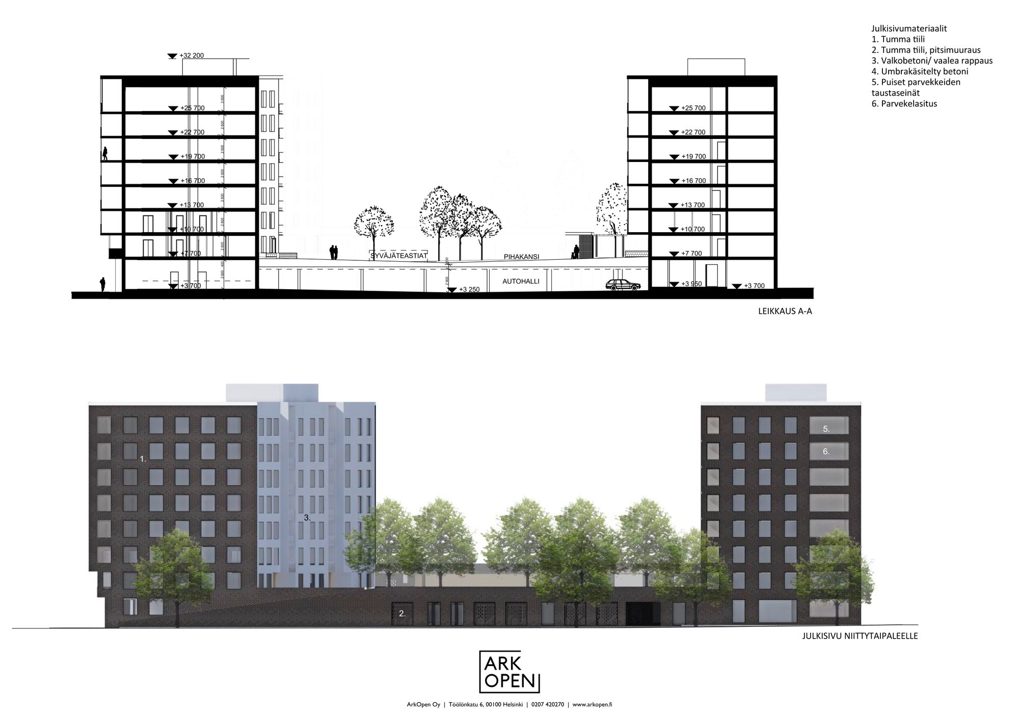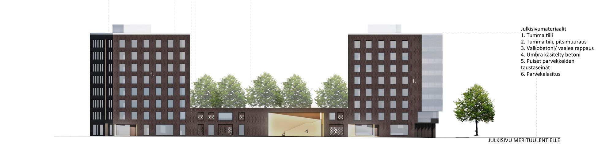 Suunnitelma jatkaa eteläpuolisen asuinkorttelin materiaali- ja massoittelumaailmaa ja pyrkii sovittautumaan sen henkeen.