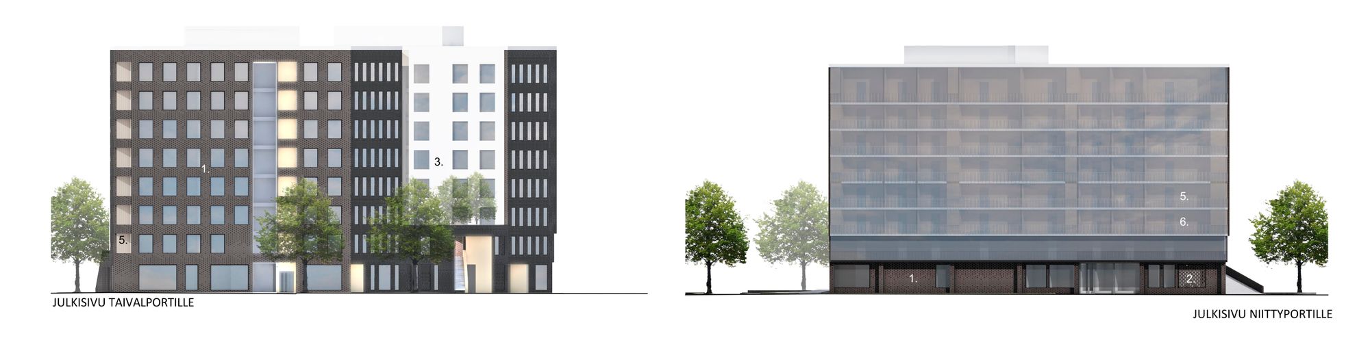 Julkisivujen värimaailma on hillitty. Katujulkisivut tehdään tiilimuurattuina tummasta tiilestä, sisäpihan julkisivut ovat valkobetonia. Sisäänkäyntien yhteydessä käytetään tehosteena umbralla käsiteltyä betonia. Autohallin julkisivut tehdään osin muurattuina, osin valoa läpäisevällä materiaalilla esim. pitsimuurauskuviolla tai perforoidulla teräksellä. Jalustan aukotuksessa vaihtelevat umpiosat, avonaiset yhteistilaosat ja osin valoaläpipäästävät osat. Tumma tiili sitoo rakennukset naapurin suurkortteliin, ja sen maamerkkitorniin.