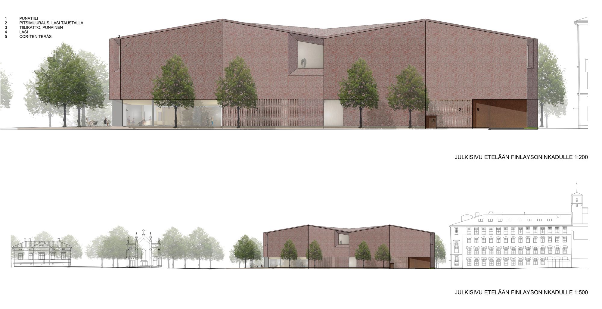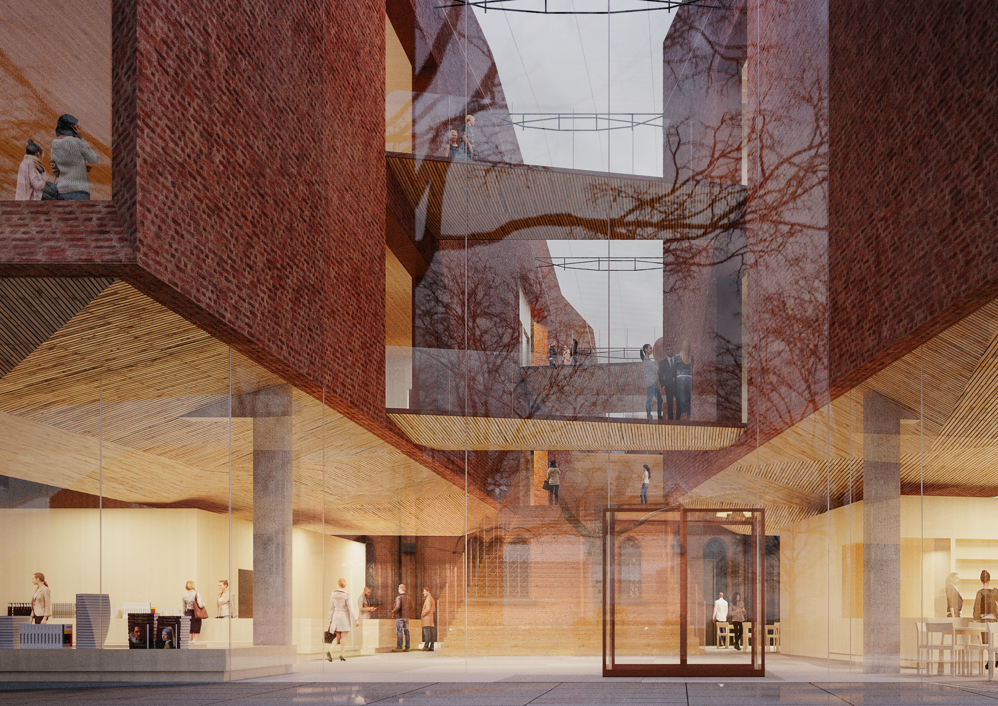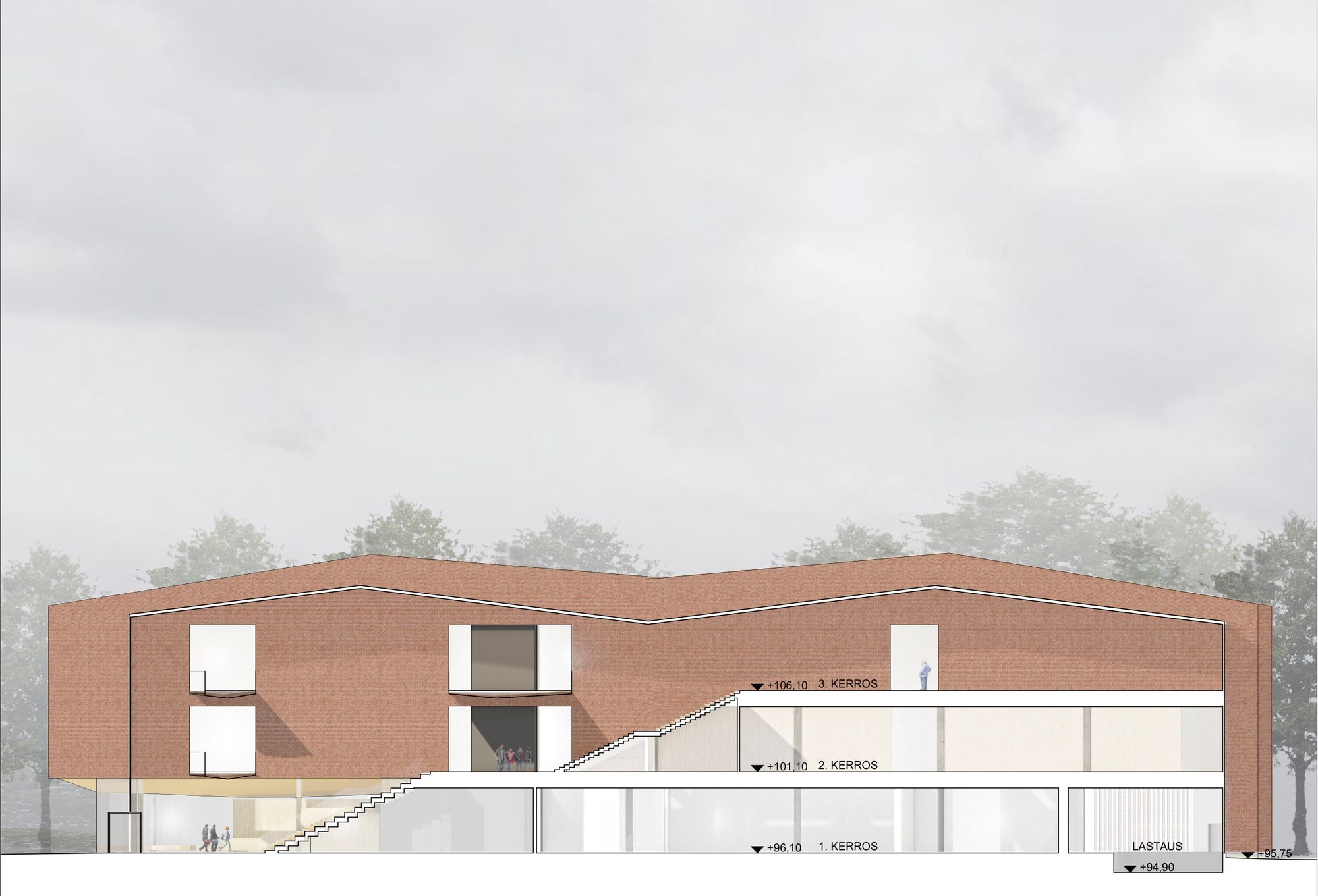 Kilpailusuunnitelma avautuu veistoksellisten tiilisiipien välistä länteen kohti kirkkoa. Lasikatteinen keskeistila ja aula hehkuvat lämpimän puun ja tiilen sävyissä ja kutsuvat kävijöitä luokseen. Tiilisiivet kurottuvat dramaattisina ulokkeina aulatilojen ylle.