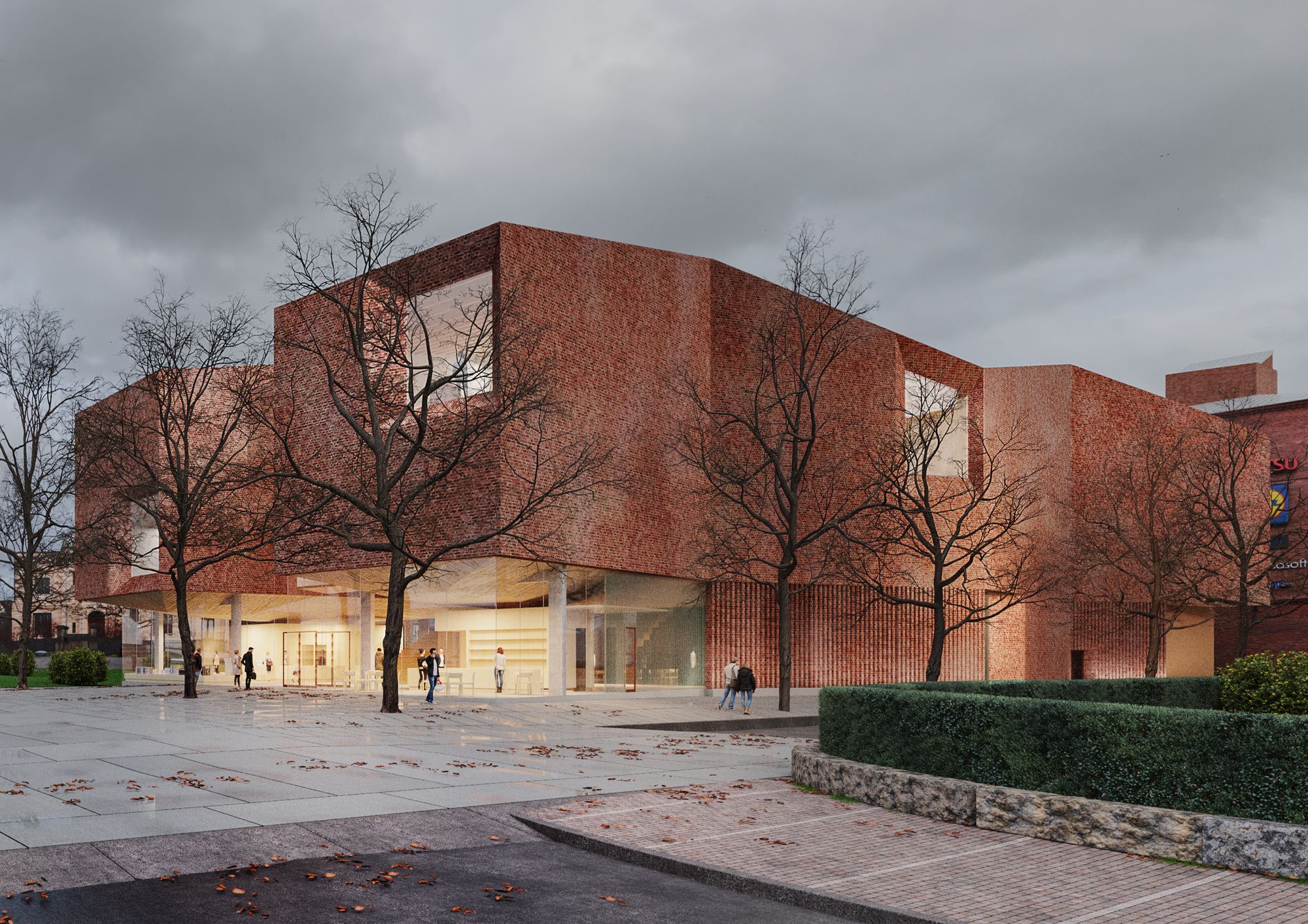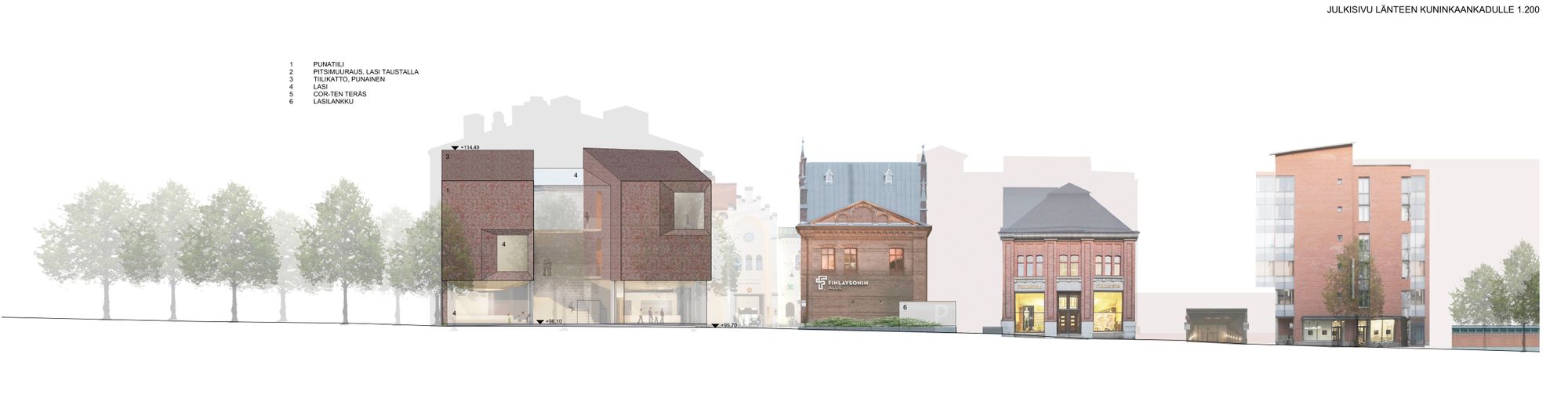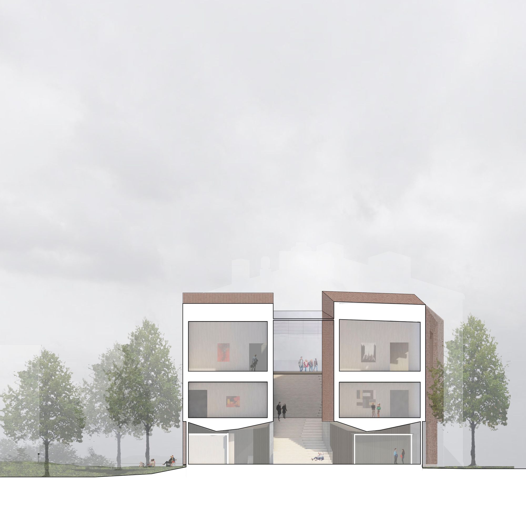 Kilpailusuunnitelma avautuu veistoksellisten tiilisiipien välistä länteen kohti kirkkoa. Lasikatteinen keskeistila ja aula hehkuvat lämpimän puun ja tiilen sävyissä ja kutsuvat kävijöitä luokseen. Tiilisiivet kurottuvat dramaattisina ulokkeina aulatilojen ylle.