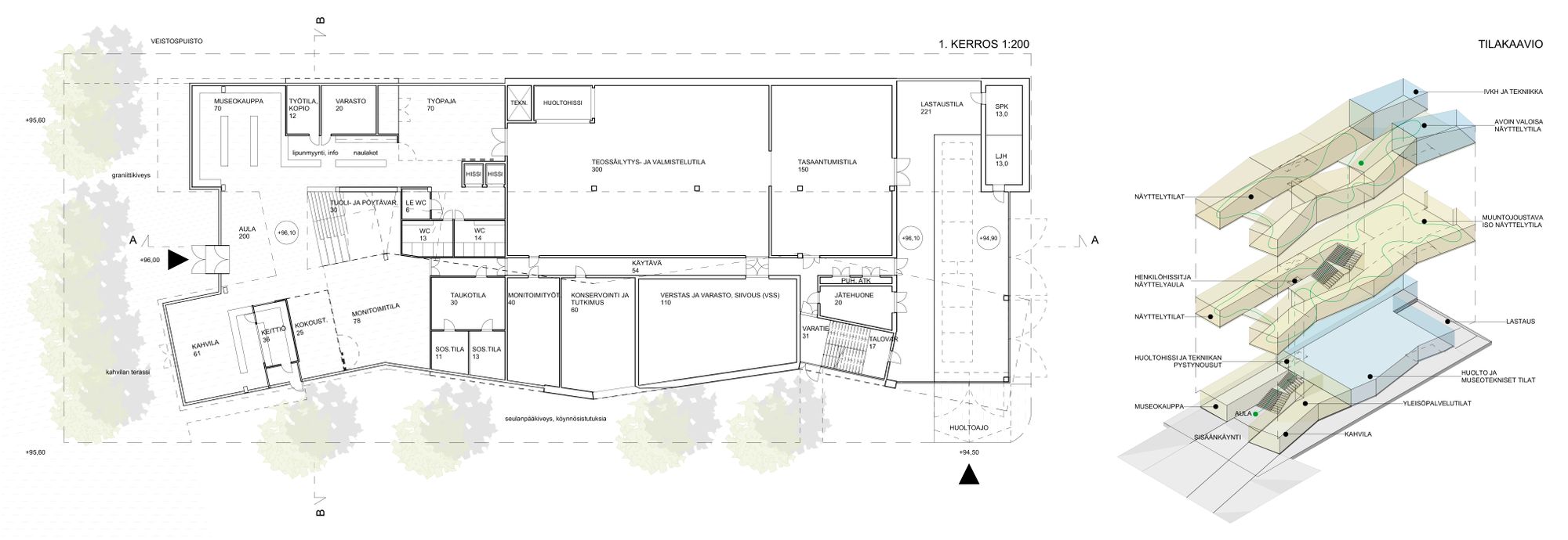 Monitoimitila ja työpaja sijoittuvat aulan jatkeena kahvilan ja museokaupan taakse. Henkilöhissit, naulakot, lokerikot ja wc-tilat sijoittuvat työpajan viereen. Ylemmissä kerroksissa hissit avautuvat keskeistilan näyttelyaulaan.