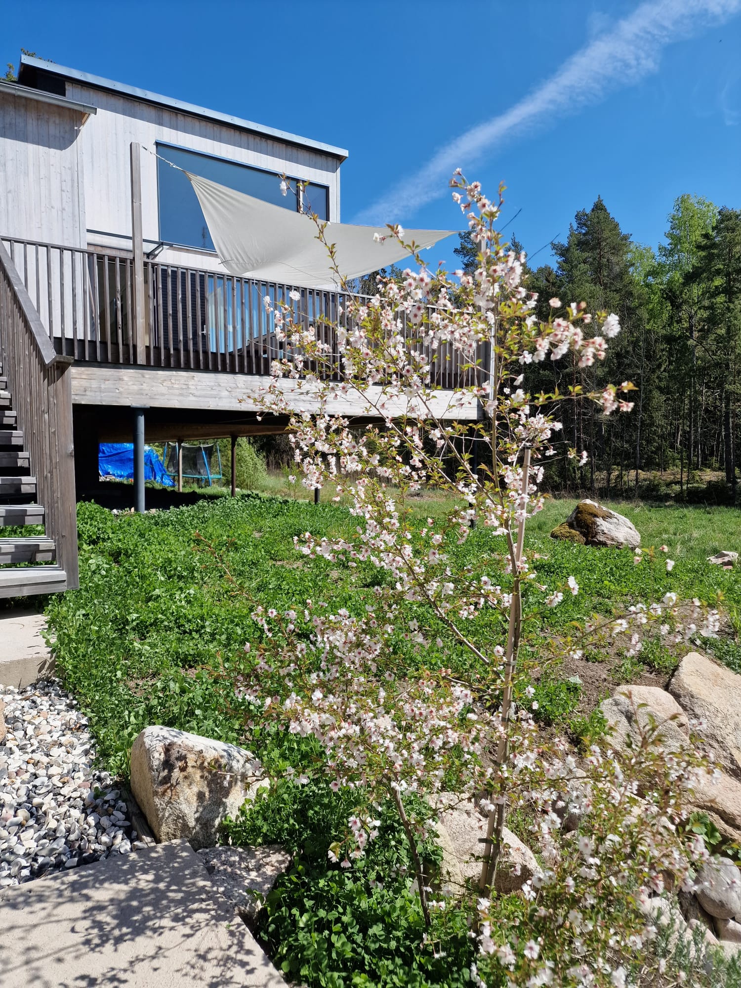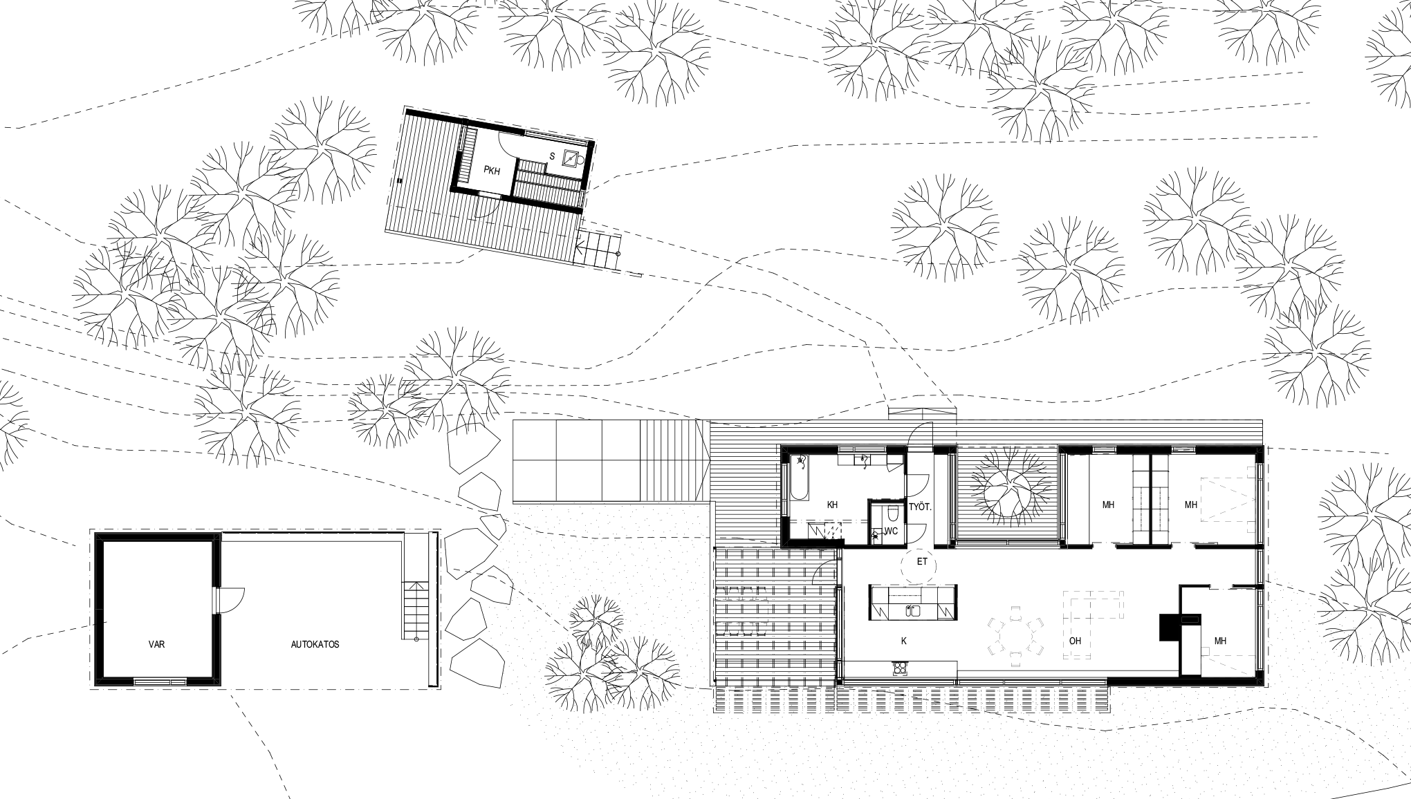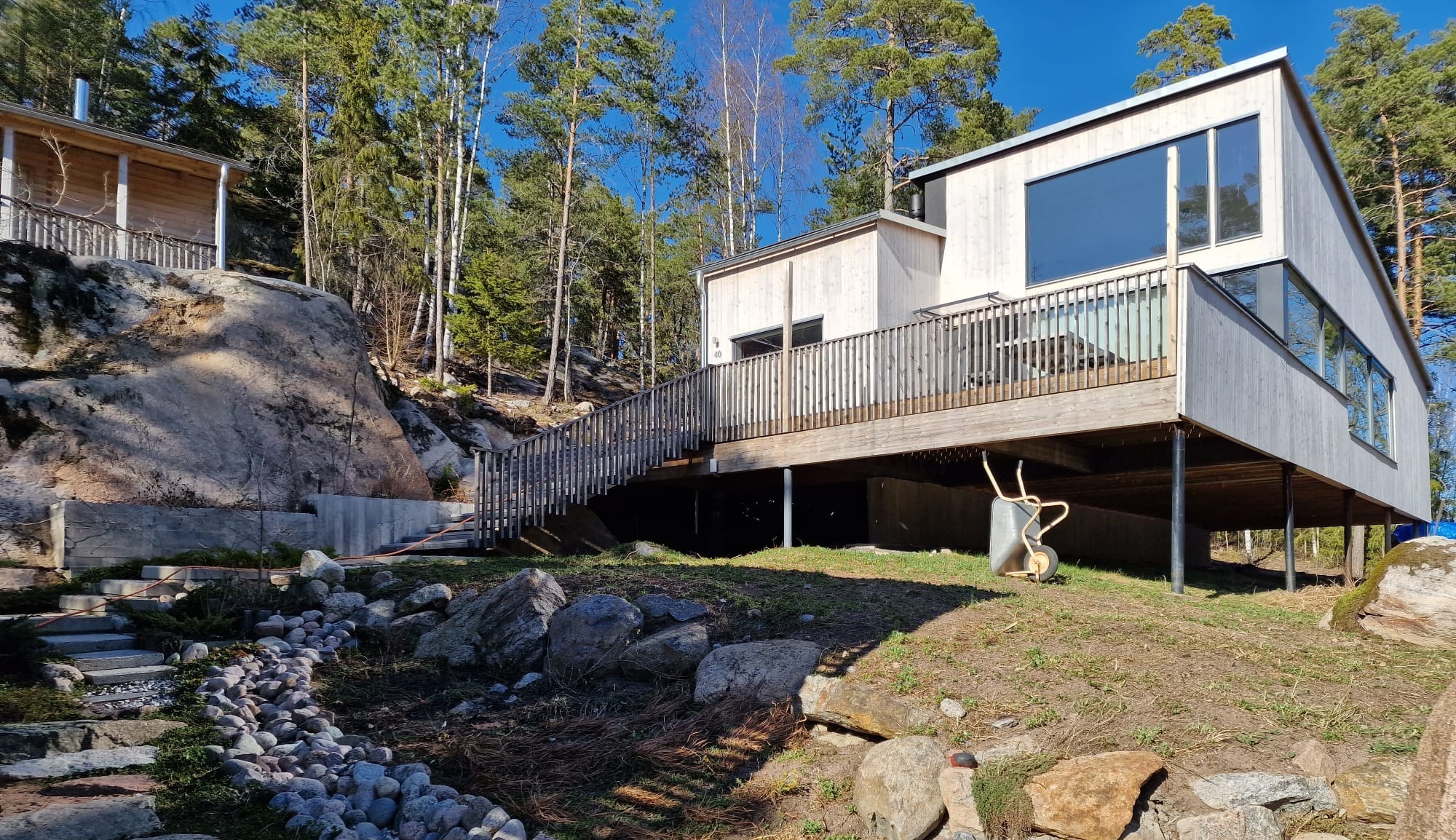 Päärakennus on tehty clt:stä, varasto on rankarakenteinen ja saunarakennus hirrestä.