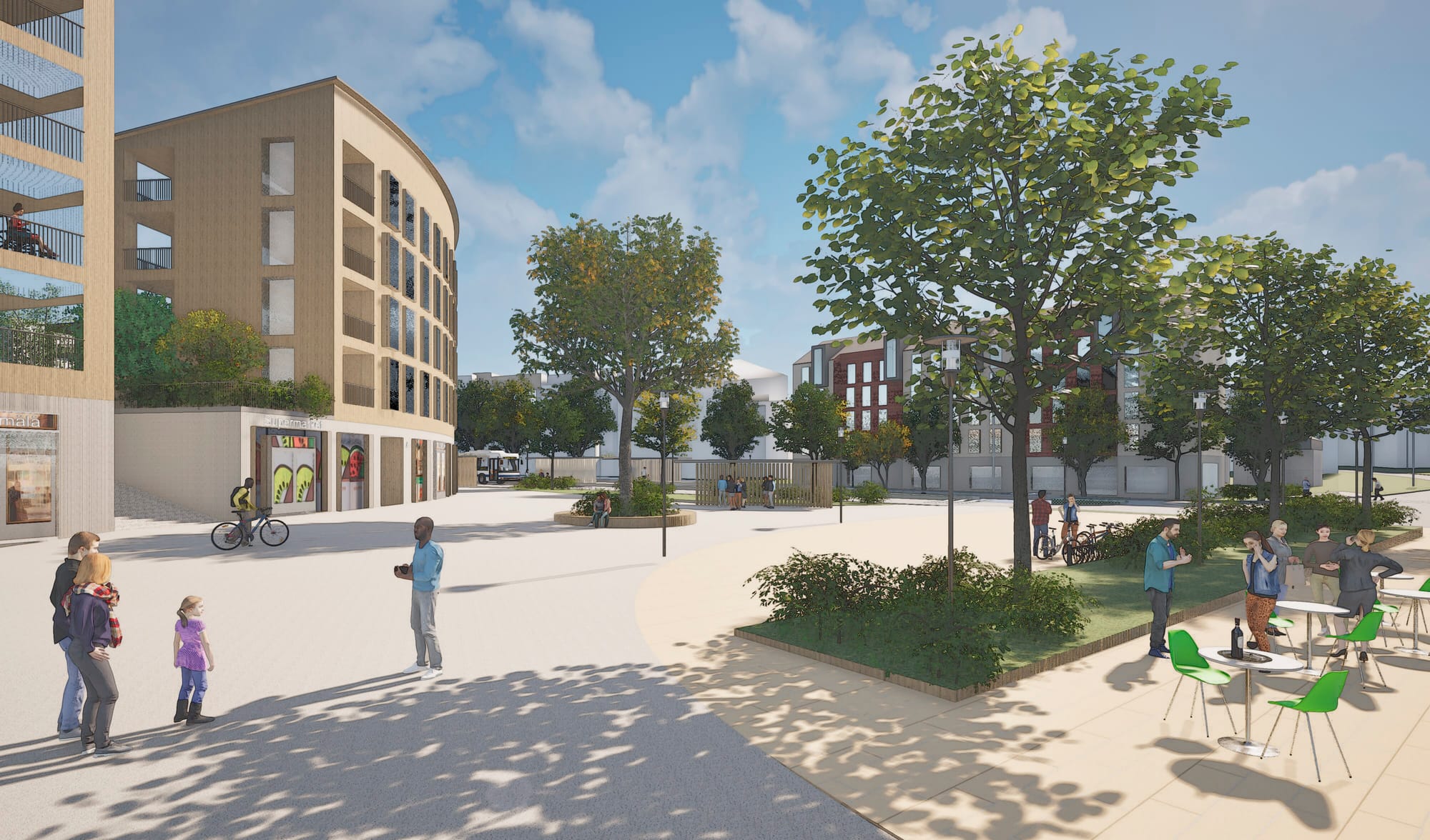 Ulkotilojen puut ja muut istutukset on ryhmitelty alueen läpi kulkevaksi vihreäksi nauhaksi, joka mahdollistaa miellyttävän liikkumisen alueella myös helleaikoina. Maanpinnan yhtenäinen käsittely ja materiaalimaailma yhdistävät aluetta ja julkisia tiloja.